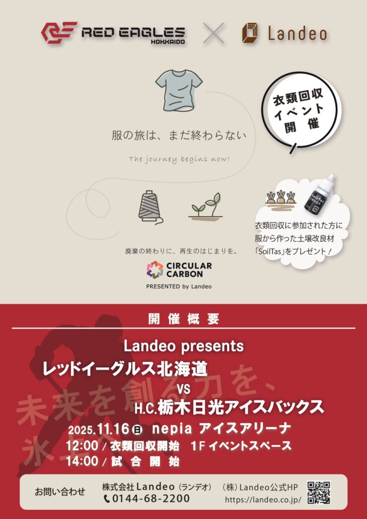 このたび、11月16日に開催される「Landeo presents レッドイーグルス北海道 vs 東北フリーブレイズ戦」おきまして、株式会社Landeoと協力し、不要になった衣類やタオルを回収し、新たな資源として生まれ変わらせるための「衣類品回収ブース」を出展することとないましたので、お知らせいたします。